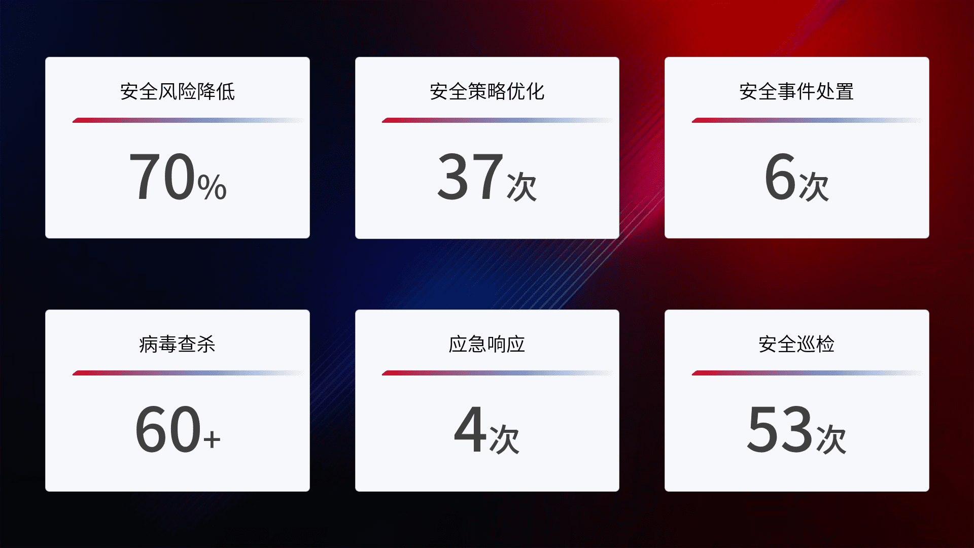 提供全面的安全事件报告体系,,包括处置报告、、、、周报、、、、季度和年度总结,,,,结合持续监控,,帮助客户深入了解网络安全状况。。。
