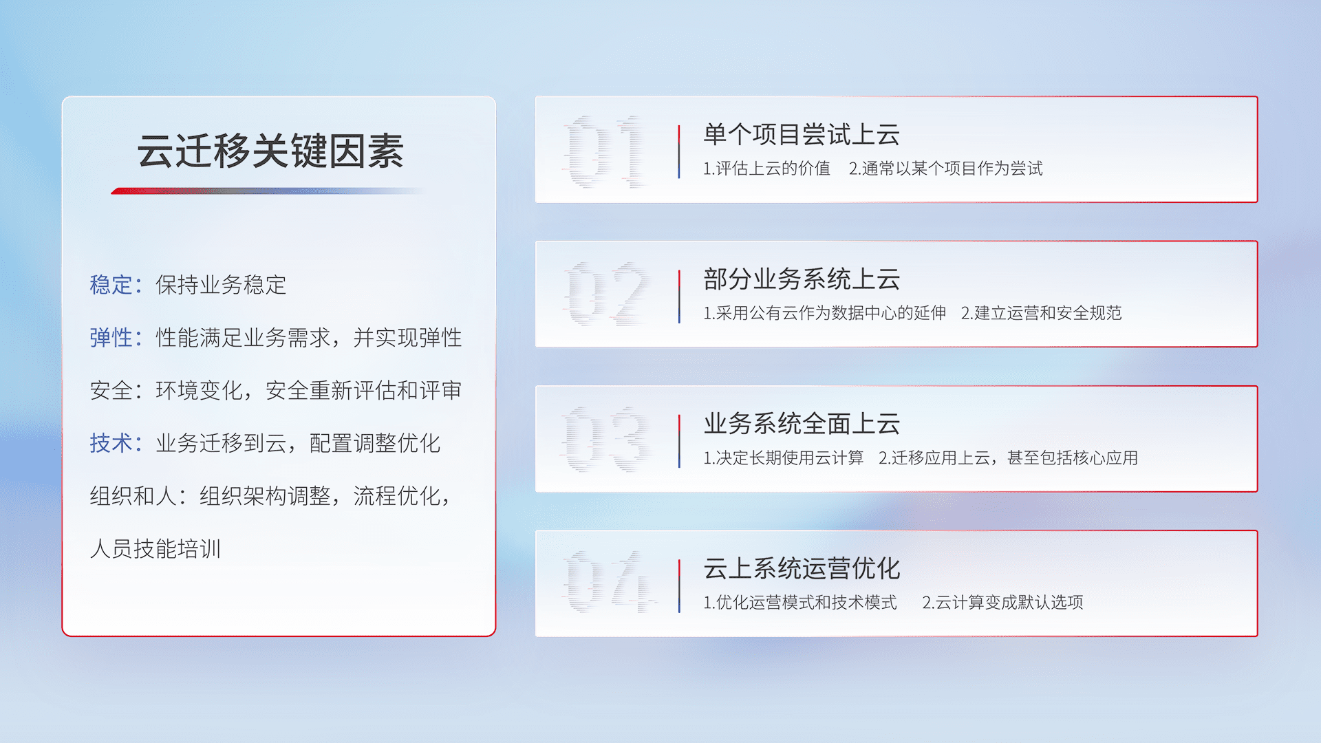 结合实际业务,,从规划设计、、云平台选型、、云原生改造、、、数据迁移、、集成交付,,,,迁移全过程为客户识别最佳上云路径,,做好风险识别管理,,,设计网络架构、、、、身份权限、、、、安全审计合规、、、、操作审计、、、、日志审计、、监控告警策略、、、多站点容灾设计等,,,,对云上基础设施进行整体规划,,,,提升IT治理水平,,,以满足弹性、、、高可用、、、、高性能的需求。。。。