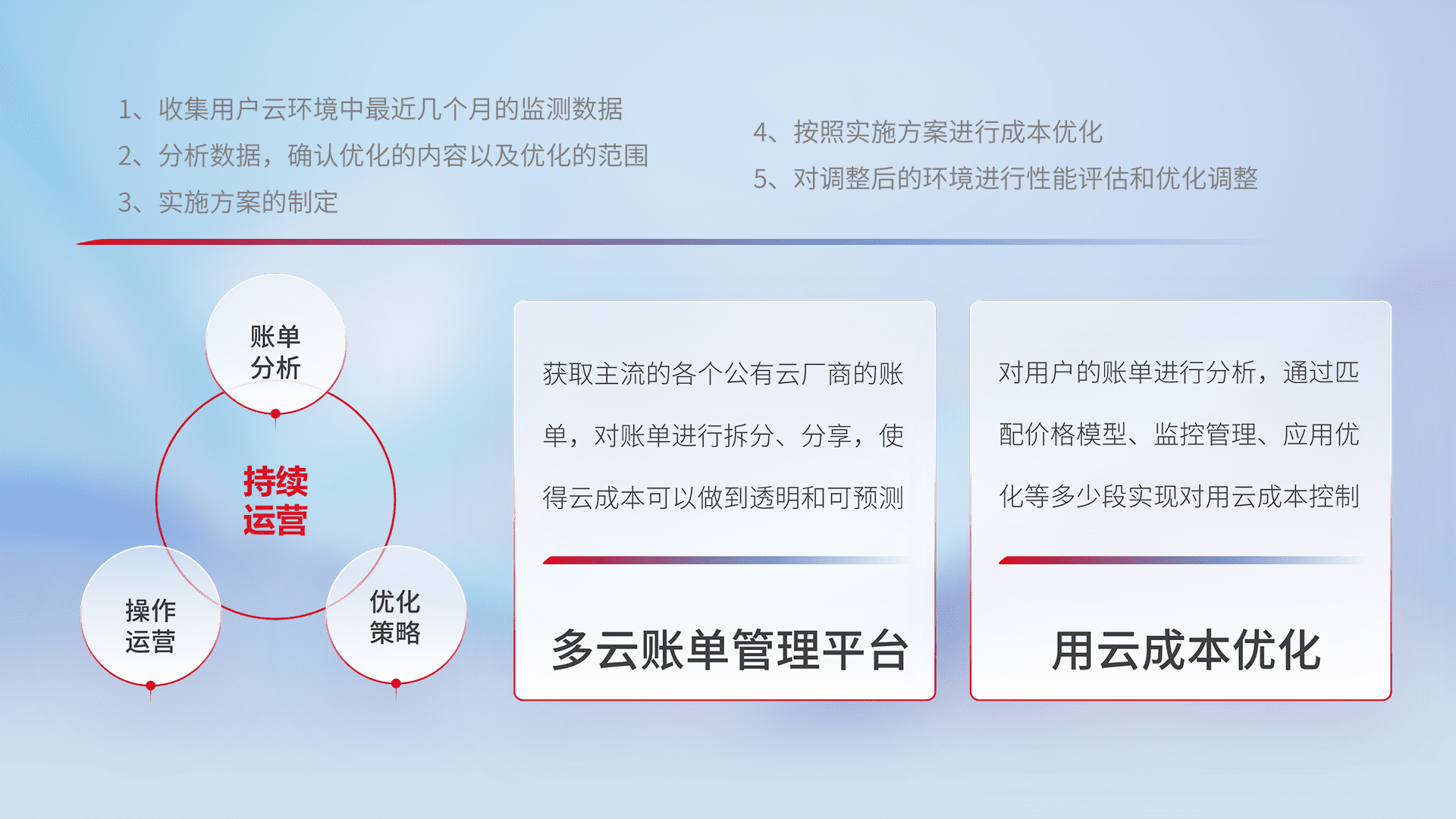 通过多云纳管,,以统一的资源数据模型把客户的云资源进行抽象和封装,,,,进而实现对多云资源的统一操作,,保障云资源管理的可靠性、、、、稳定性与可用性。。量身定制化运维内容,,,配置、、开发运维、、补丁管理、、备份、、、监控、、认证和访问管理、、、审计和日常巡检等,,保障在用云过程中的可靠度,,,稳定度以及高可用率。。。