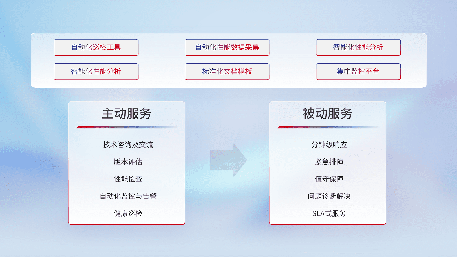 智能化工具和标准化文档,,,,保障服务质量,,提供主动服务(包含技术咨询、、版本评估、、、性能检查、、自动化监控与告警、、健康巡检)和被动服务包含(分钟级响应、、紧急排障、、、、值守保障、、问题诊断解决、、SLA服务)。。。。